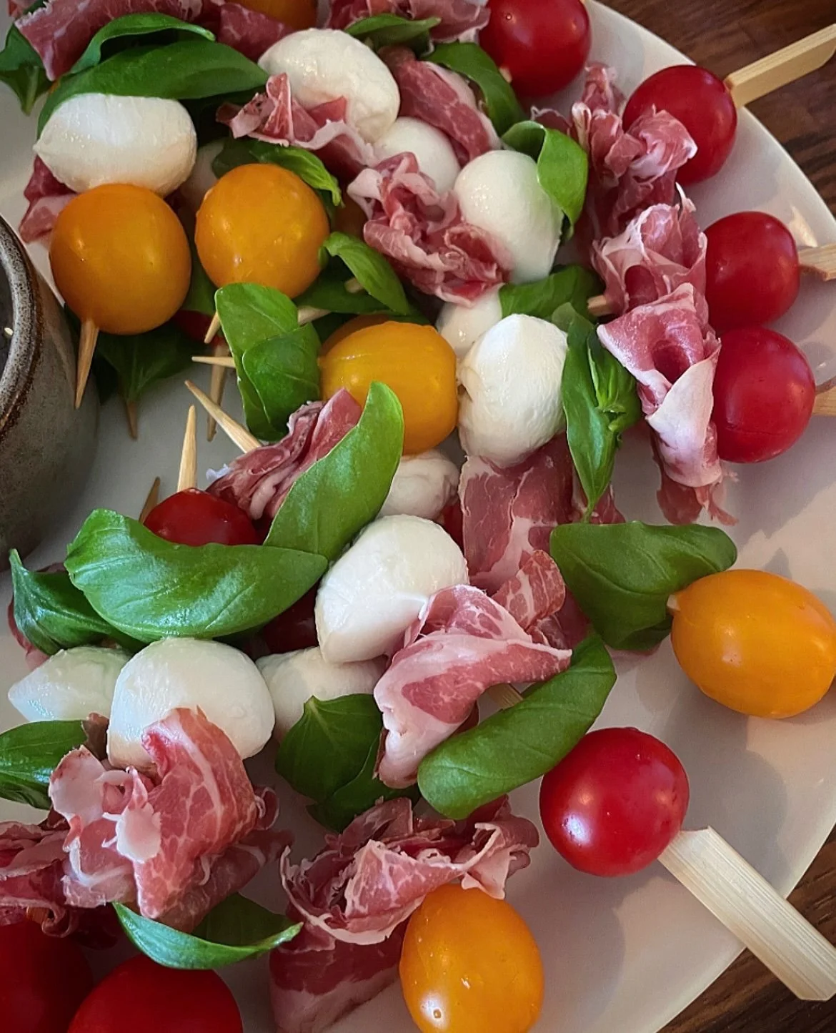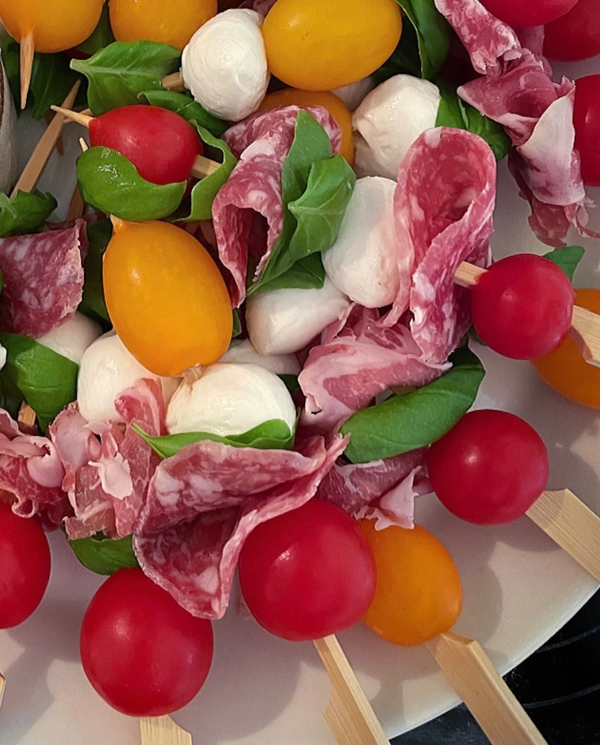 Sjekk at salami, skinke og tomater er i passende størrelse i forhold til pinnene du har. Når alt er klart er det bare å tre de på i ønsket rekkefølge, og dandere de over på et fat. Oppbevares i kjøleskap fram til servering.