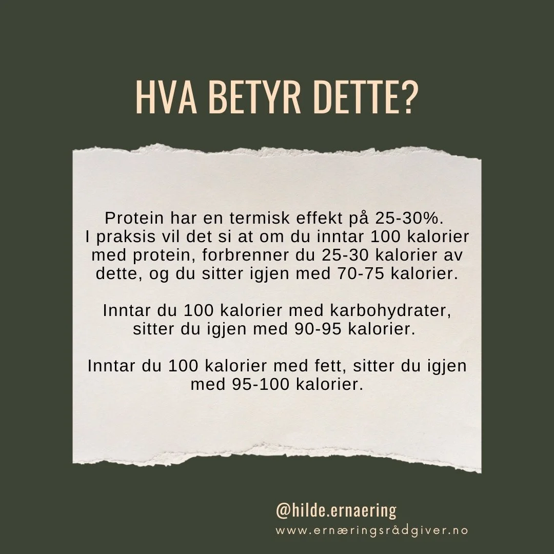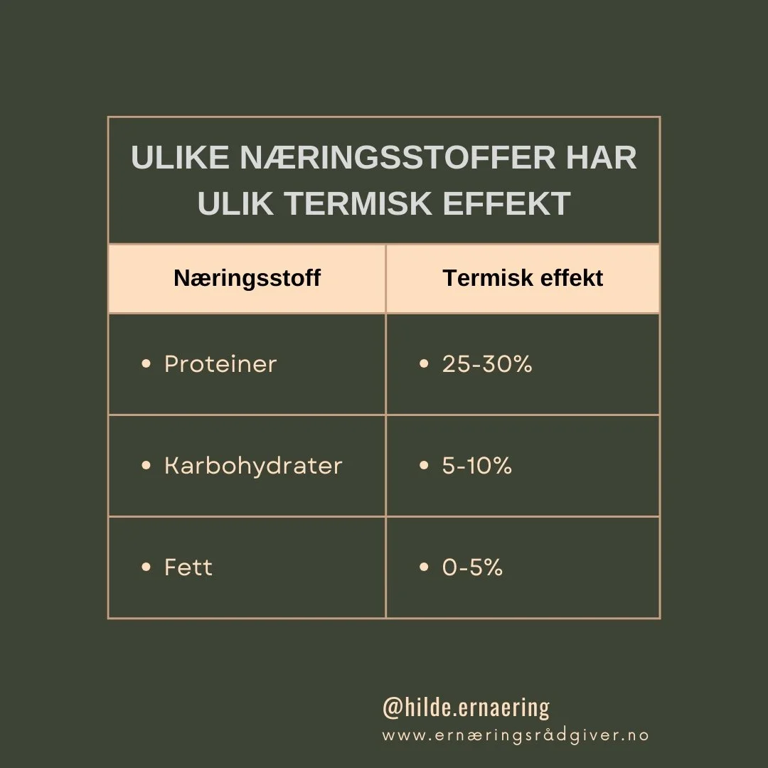 I tillegg til at protein, karbohydrater og fett inneholder ulik mengde kalorier pr gram, har de også ulik termisk effekt. I praksis betyr det at hvordan du setter sammen næringsstoffene dine (makrofordelingen) kan ha stor effekt på resultatet, selv om kaloriinntaket er det samme.